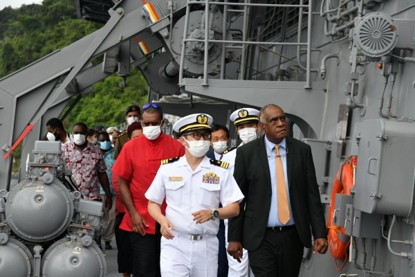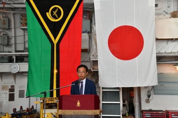 護衛艦「きりさめ」ポートビラ寄港に伴う艦上式典への参列(令和4年8月12日) 令和4年8月12日 令和4年8月12日、ポートビラ港に寄港していた海上自衛隊の護衛艦「きりさめ」艦上にて海上自衛隊主催の式典(儀仗式)が催され、千葉大使、イシュマイル・カルサカウ副首相、各国高等弁務官等が参列しました。